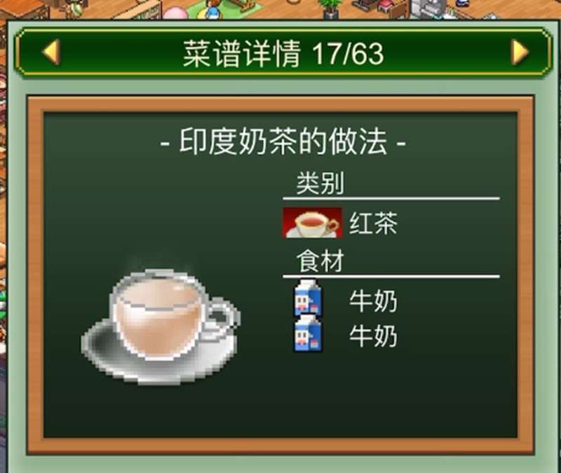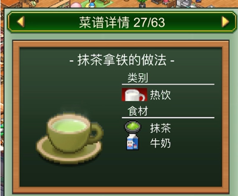 进入游戏中期后,可以解锁更多热饮。茶拿铁将抹茶和牛奶结合,不仅口感好,外观也十分吸引人。可可饮品由可可粉和牛奶粉制成,甜而不腻。热奶昔则需要牛奶和蛋黄,口感绵密,适合喜欢浓郁口味的顾客。