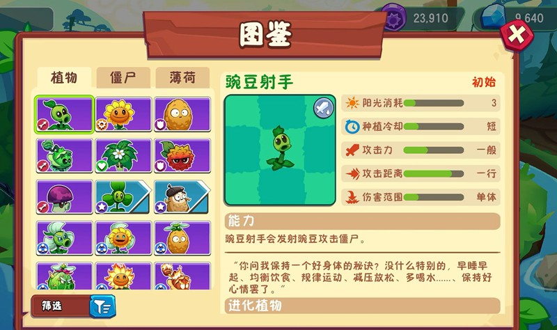 豌豆射手是植物大战僵尸3中非常经典的植物之一,从一代开始就陪伴着玩家对抗僵尸。它在本作中依然作为初始植物出现,攻击方式与前两代类似,都是通过发射豌豆来打击敌人。不过这次它还能与三叶草融合,形成旋风豌豆,具备击退僵尸的能力,让战斗更加灵活。