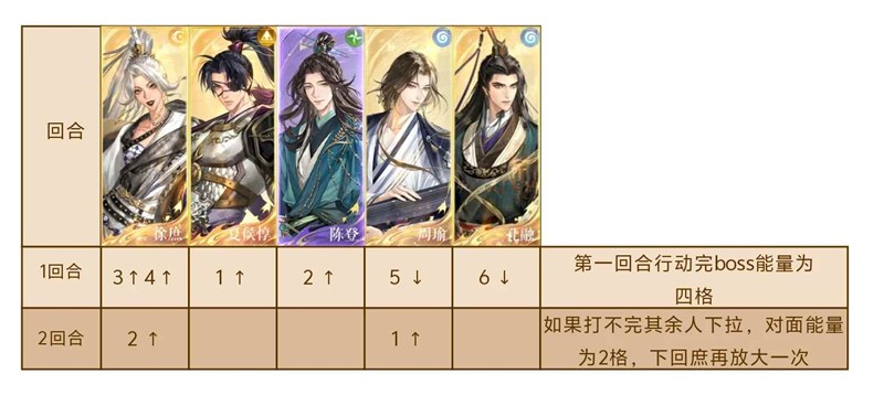 第二回合周瑜开大,会给boss+1格能量变成两格,ee开大,不加能量,攻击够的到这对面就无了直接结束战斗,没打完的其他密探下拉,下回合再补一个大基本上也行了。