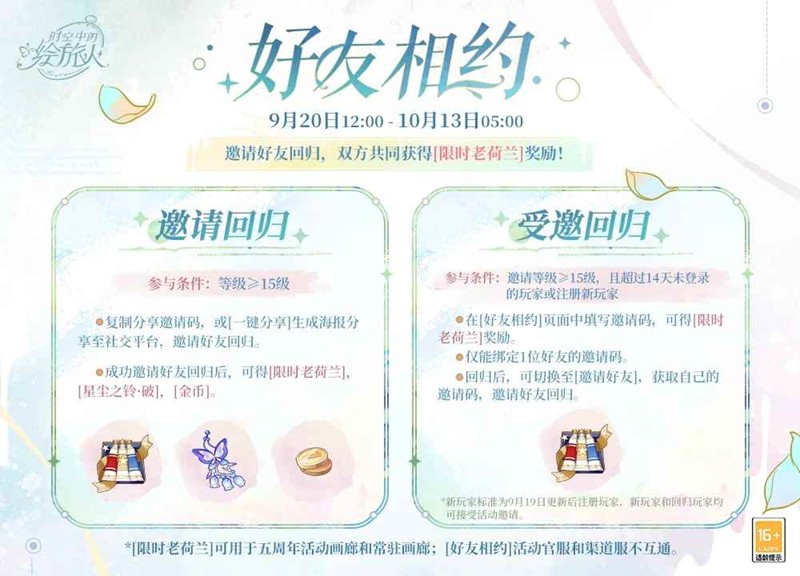 时空中的绘旅人好友相约·回归有礼分享邀请码可获奖励~9月20日12:00后 - 2025年10月13日,活动期间,邀请等级≥15级,且超过14天未登录的玩家或注册新玩家登录游戏并填写邀请码,双方都可获得邀请奖励。一起来和小编看看吧~
