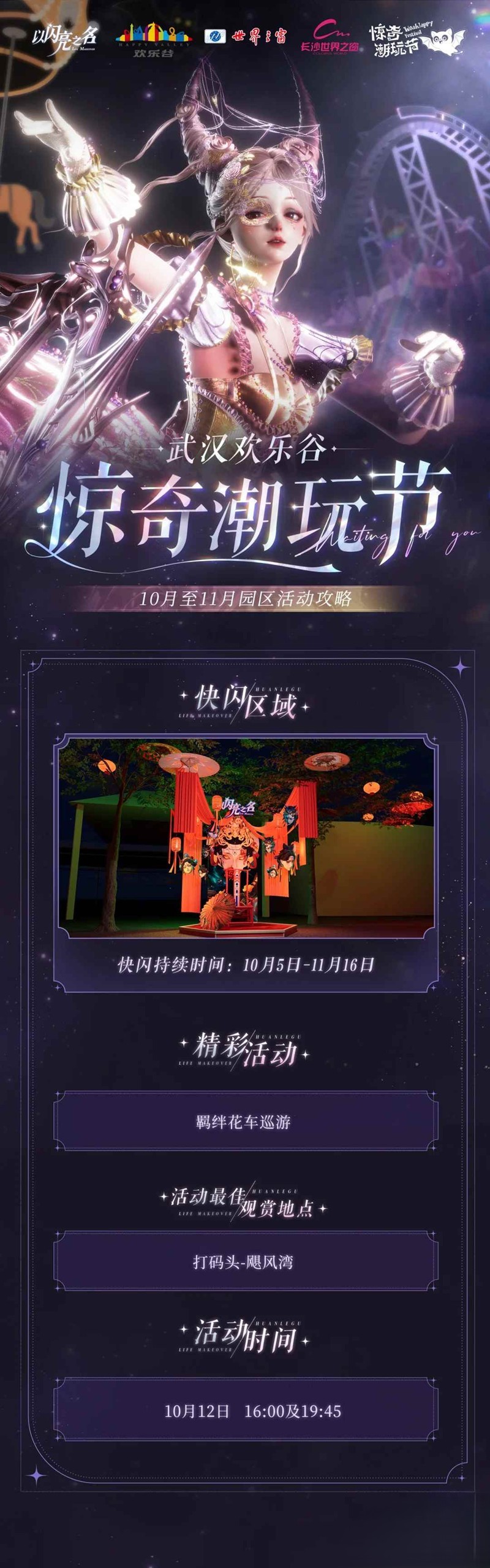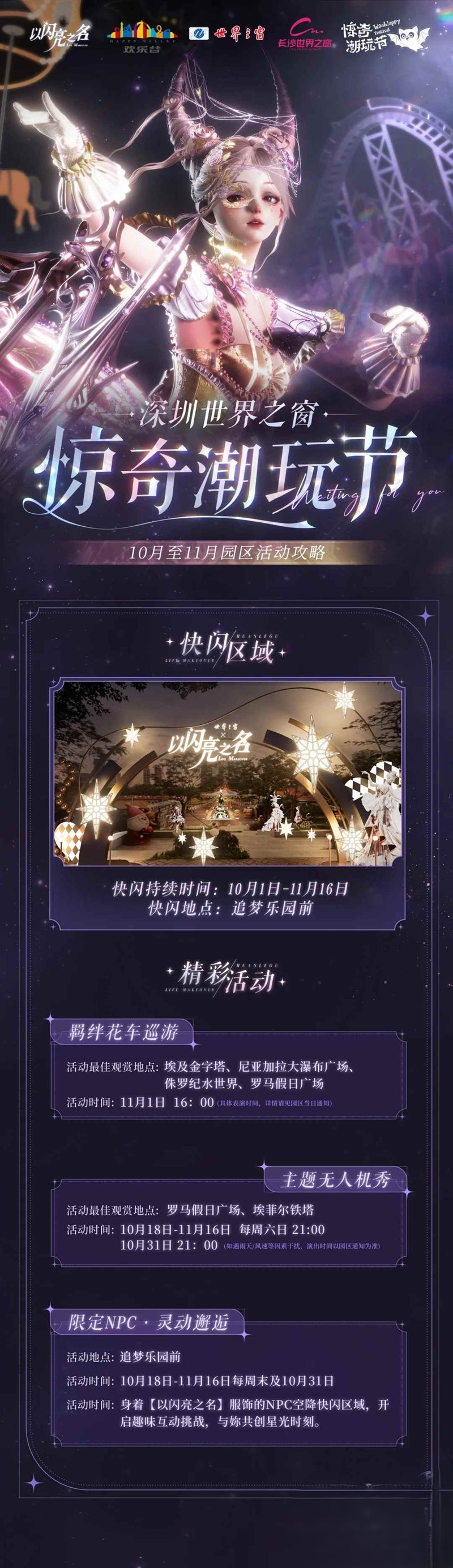以闪亮之名携手欢乐谷集团线下联动第三弹情报全解锁来啦~旗下武汉欢乐谷、深圳世界之窗、长沙世界之窗亮点公布!绝美无人机秀将点亮天际,照应心动瞬间!合伙人们!本喵手握第一消息立马前来汇报!园区细节和男主排期曝光!