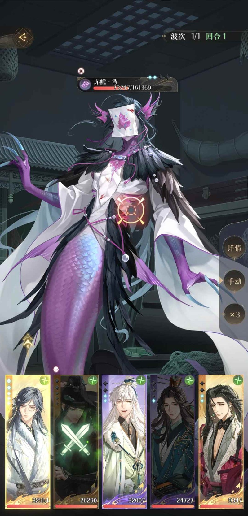 阳属性密探三个比较好,注意其他属性密探攻击会使赤鱬能量+1,感觉该回合可以过就直接打不用算了,血条消失就行