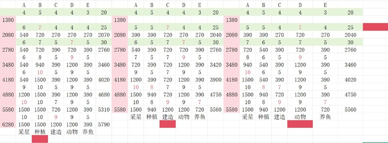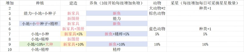 然后再结合我其余6个号,我发现了能力等级应该升级的优先级是《动物>采星>种植>建造>养鱼》