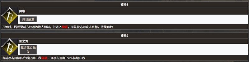 黑骑士的普通攻击是剑幕,能够以较低的能量消耗打出高伤害,3x28%敏捷加成配合基础攻击力,让他的输出效率非常高。而能量技能缭乱斩击则是爆发期的核心技能,270%敏捷与330%攻击力的叠加伤害,配合溅射效果,能对敌方阵型造成大量伤害。这两个技能配合被动效果,可以在战斗开始时就切入后排,实现快速击杀。