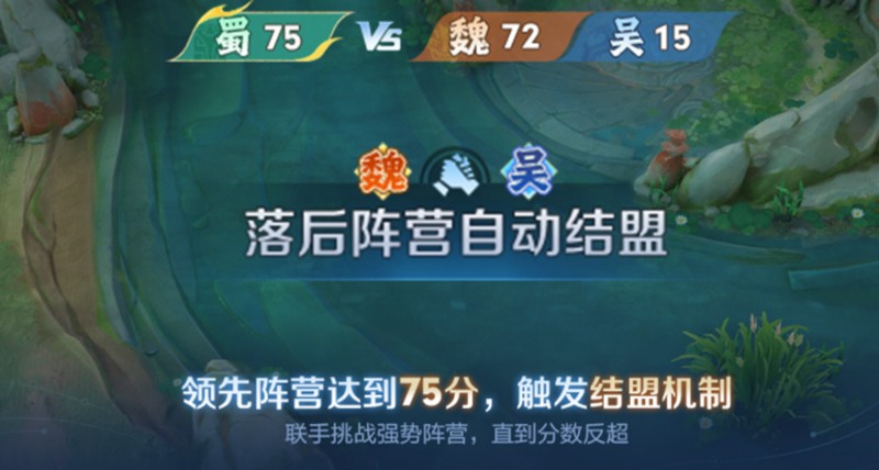 星火赤壁引入了“合纵连横”机制,当某一阵营率先达到75分时,其他两方会自动结盟,共同对抗领先的一方。但联盟关系并非固定不变,一旦某一方反超,联盟就会立即转换,新的对抗格局随之形成。这种动态变化让战局始终处于不断调整之中,玩家需要时刻关注分数变化并及时调整战术。