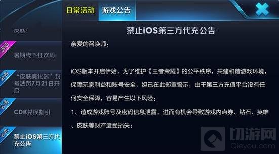 IOS第三方代充,一直是我们严厉打击的行为。针对第三方代充行为,我们也在游戏内进行了长期公告说明: