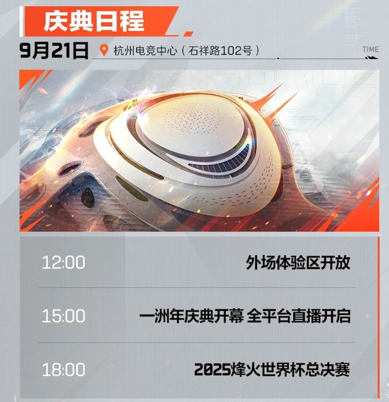 9月21日12:00:外场体验区开放,玩家可以提前到场体验各种互动活动。15:00:一洲年庆典开幕,全平台直播同步开启。18:00:2025烽火世界杯总决赛正式打响,全球顶尖战队将展开激烈对决。