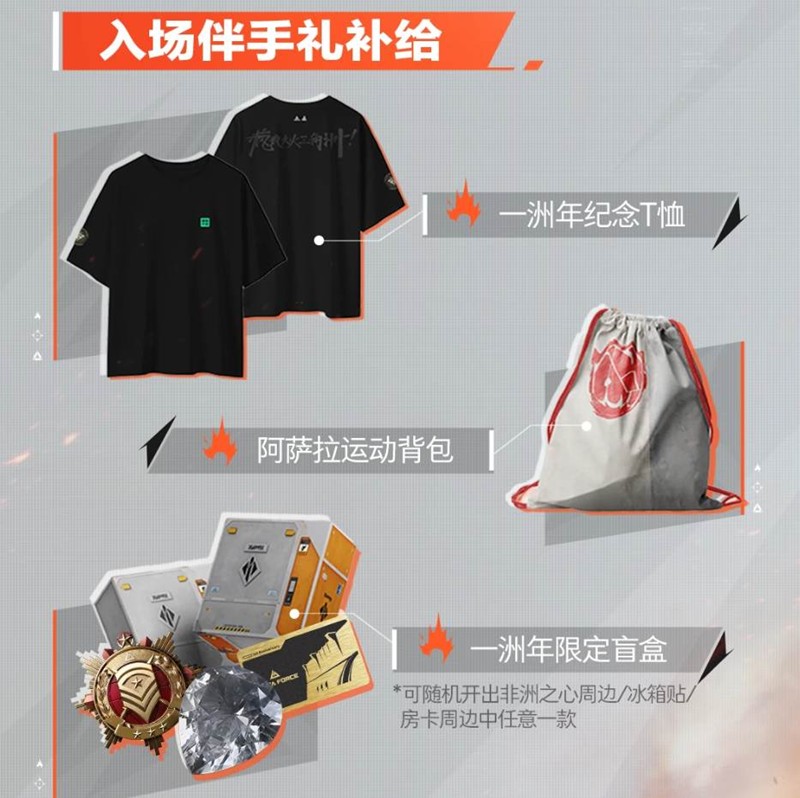 入场伴手礼补给:一洲年纪念T恤、阿萨拉运动背包、一洲年限定盲盒等精美礼品等你来拿。