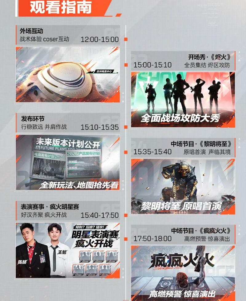 发布环节:15:10-15:35,行楷致远并肩作战,未来版本计划公开,全新玩法、地图抢先看。