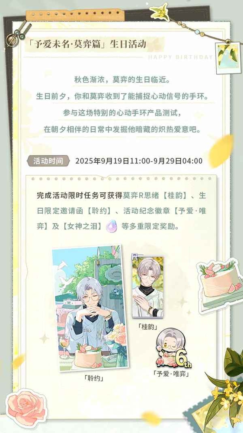 活动期间,完成活动限时任务可获得莫弈R思绪【桂韵】、生日限定邀请函【聆约】、活动纪念徽章【予爱·唯弈】及【女神之泪】等多重限定奖励