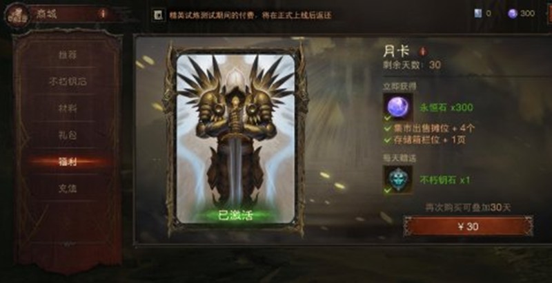 暗黑破坏神不朽的基础月卡价格为30元人民币,有效期为30天。购买后玩家可立即获得300永恒钻石,同时在持续30天的周期内,每天登录均可领取1个不朽钥石。不朽钥石是参与高阶副本与获取传奇装备的重要道具,每日稳定获取对角色养成节奏有显著帮助。按时间折算,该月卡相当于每天花费约1元即可获得持续收益,在暗黑破坏神不朽的整体付费结构中属于门槛较低且回报稳定的选项。