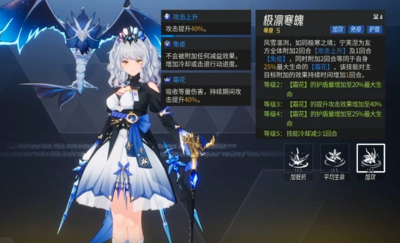 宁芙涅的普通攻击名为冻凝华,基于冰霜元素对敌方单体造成伤害,并有一定概率为自身附加抵抗上升状态,持续数回合。该状态可降低被控制的概率,提升其在关键回合的稳定性。在副本战斗中,由于该技能伤害较低且非核心功能,通常不建议投入技能点。但在竞技对战中,当技能等级提升至特定阶段后,可解锁速度提升效果,有助于宁芙涅更快出手,抢占先机施加团队增益,此时可根据资源情况适当升级,以优化出手顺序。