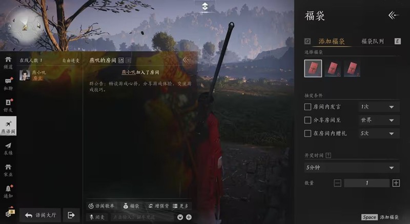 房主可在燕语阁房间内发放福袋,设定参与资格,满足资格的玩家自动参与抽奖,福礼添趣,希望新老朋友都能舒适相聚,畅享闲趣。