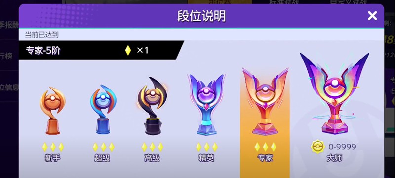 宝可梦大集结的段位系统从低到高依次为新手、超级、高级、精英、专家和大师。前五个段位均设有细分等级,其中新手段位包含三个小阶,超级段位有四个小阶,而高级、精英和专家每个段位都划分为五个小阶段。玩家需要通过参与段位赛积累积分来提升段位,每完成一定数量的比赛并获得胜利后,可逐步晋升。