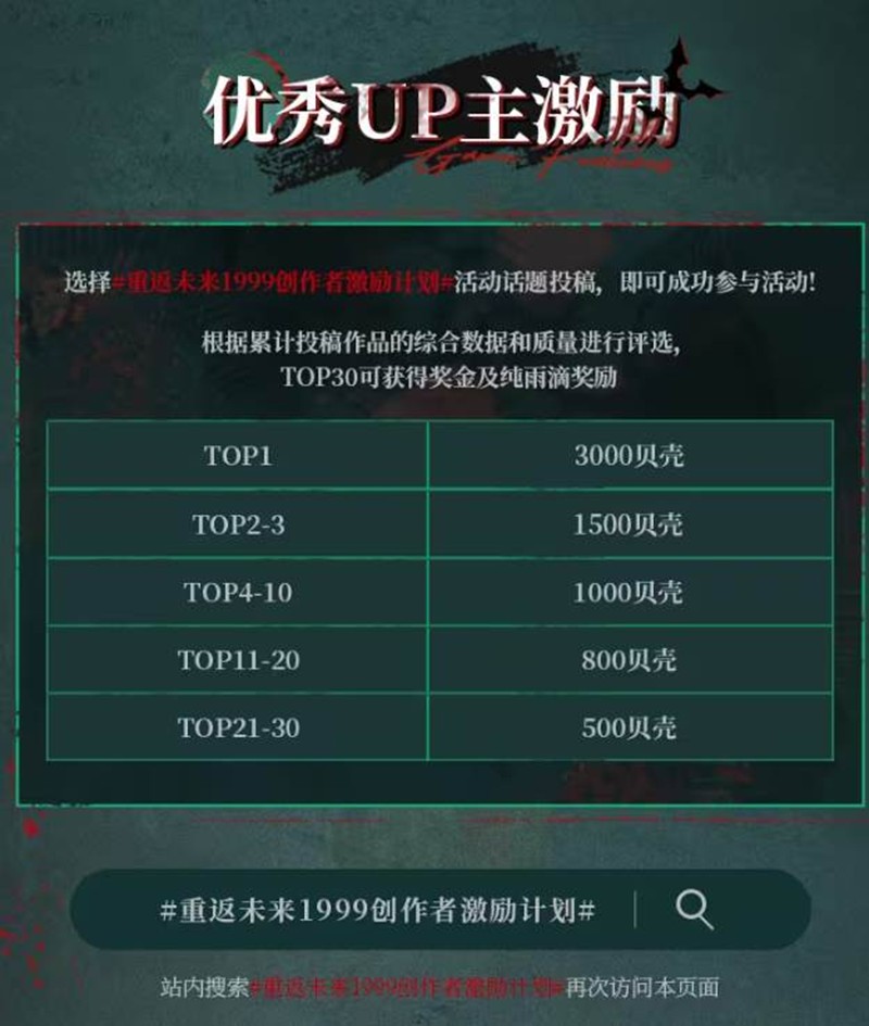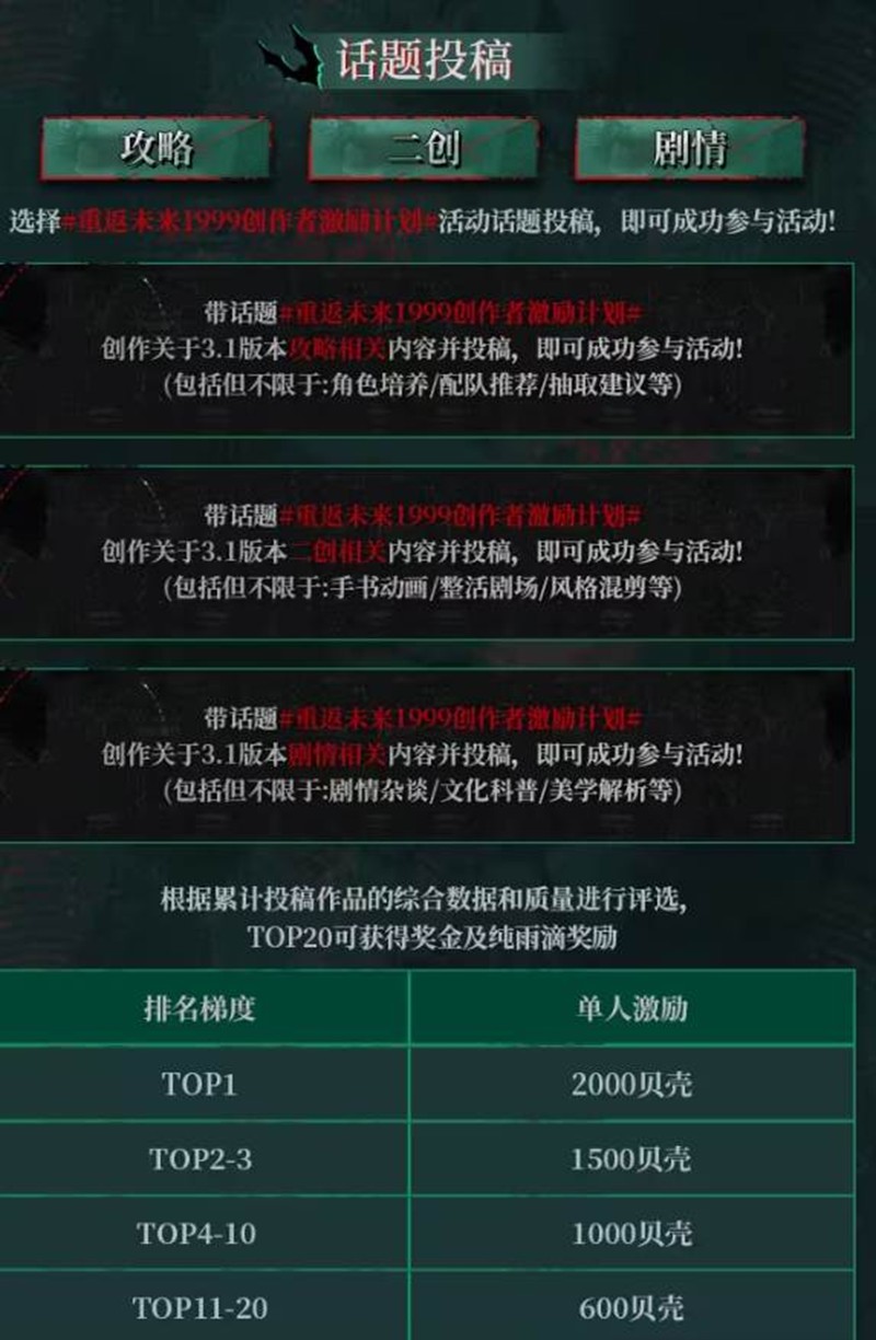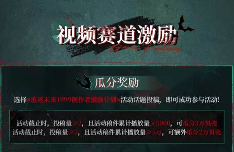 参与视频赛道的玩家,选择#重返未来1999创作者激励计划#活动话题投稿,即可成功参与活动。活动截止时,投稿量≥2,且活动稿件累计播放量≥5000,可瓜分3万贝壳;投稿量≥3,且活动稿件累计播放量≥5万,可额外瓜分2万贝壳。