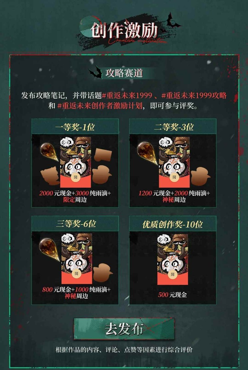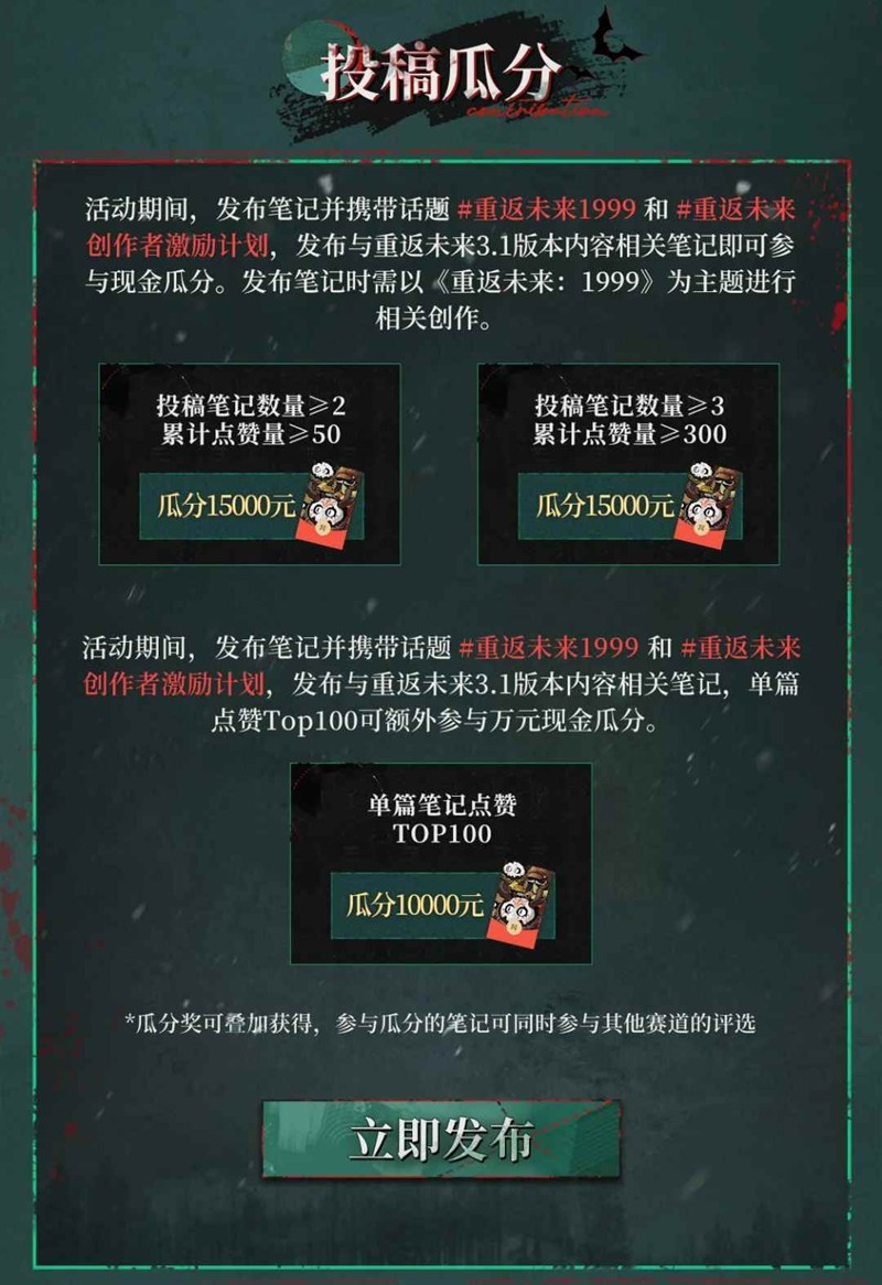 活动期间,发布笔记并携带话题#重返未来1999和#重返未来创作者激励计划,发布与重返未来3.1版本内容相关笔记,单篇点赞Top100可额外参与万元现金瓜分。