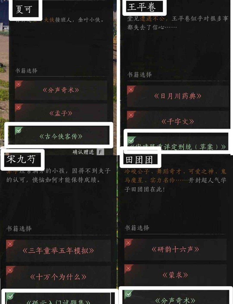 夏可-《古今侠客传》,王平卷-《宋建隆重详定刑统》,宋九芍-《孤云入门试题集》,田团团-《分身奇术》。