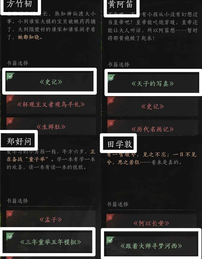 方竹韧-《史记》,黄阿笛-《天子的写真》,郑好问-《三年童举五年模拟》,田学敦-《跟着大师寻梦河西》。