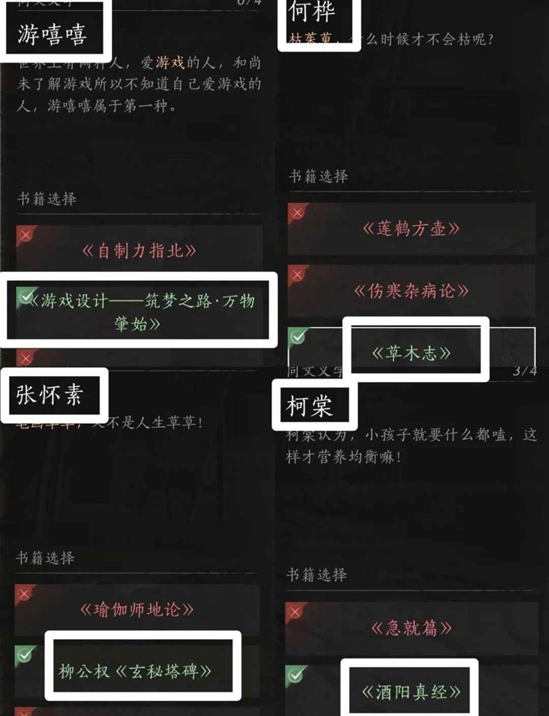 游嘻嘻-《游戏设计-筑梦之路万物肇始》, 何桦-《草木志》,张怀素-《柳公权-玄秘塔碑》,柯棠《酒阳真经》。