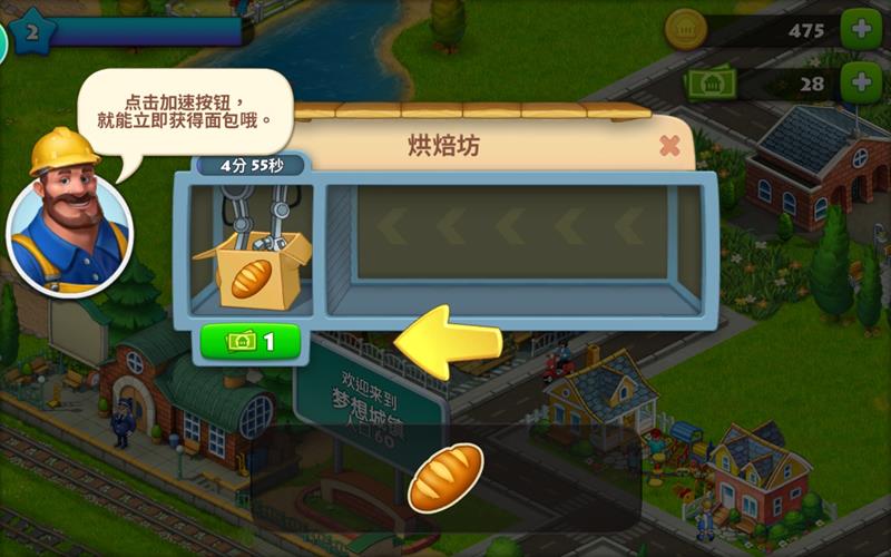 建造任何建筑都需要消耗一定人口和资源,建好后点击烘焙坊就能开始生产,将面包拖到传输带上的空盒即可启动制作,初期每个面包需要5分钟制作时间,也可以使用绿钞立即完成。