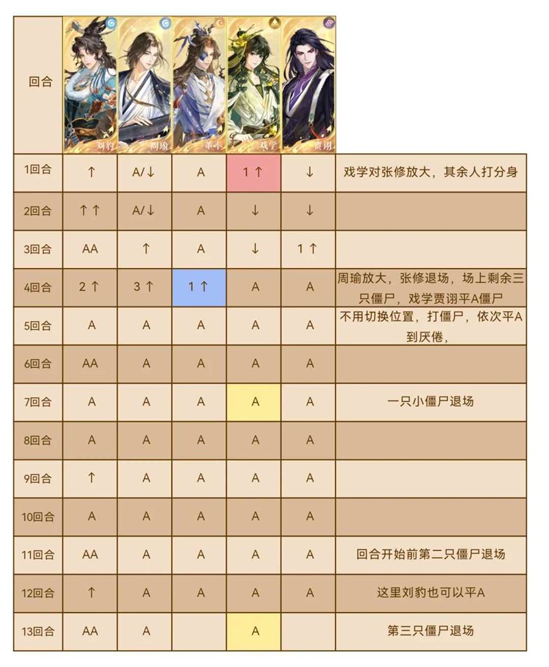 伤害足够的情况下张修第四回合自身开大前退场(周瑜开大时退场)。后续慢慢打小僵尸即可。