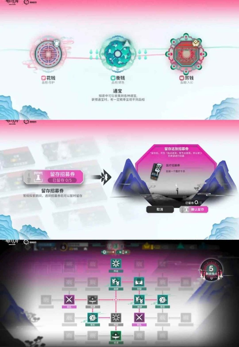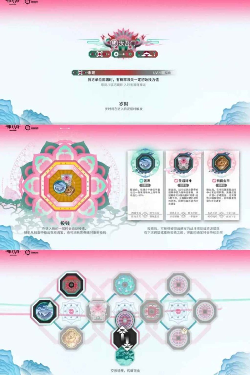 另外就是关于钱币(也就是“通宝”),界园中有三种钱币,效果比较均衡的衡钱,能带来稳定增益的花钱和效果激进的厉钱。初始钱盒中有八枚钱币,每次会投掷出三枚,如果不满意可以免费重投一次,后续重投需要票券(建议在Boss战前投到自己心仪的)。战斗结束或者某些事件结束会给钱币,这里建议避开厉钱,因为“厉钱太猛真的太猛你把握不住”。