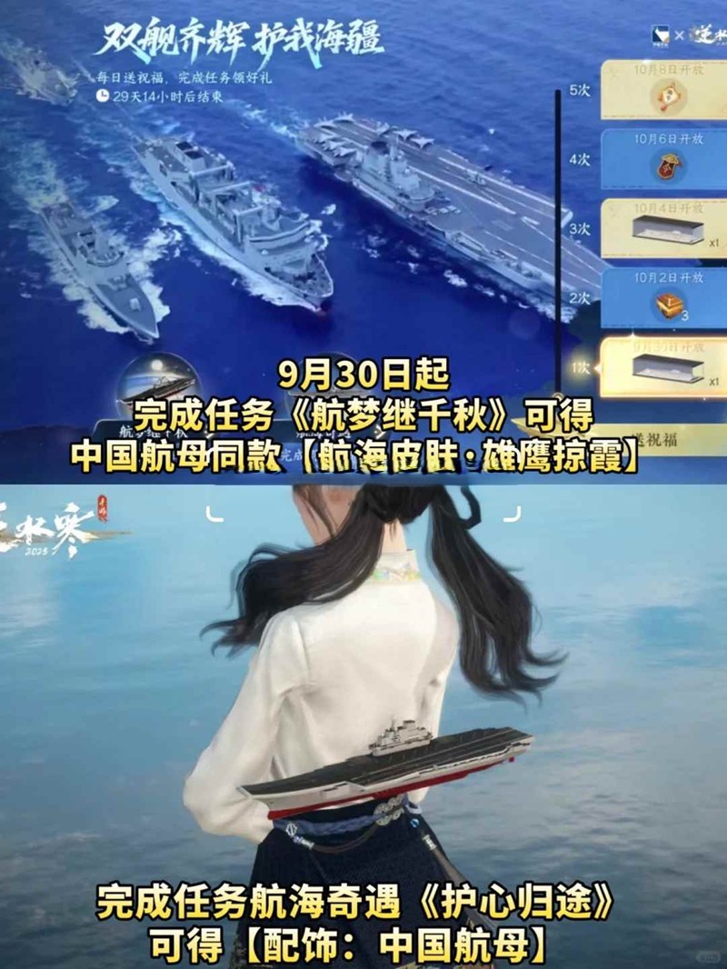 9月30日起,完成任务《航梦继千秋》可得中国航母同款【航海皮肤·雄鹰掠霞】。