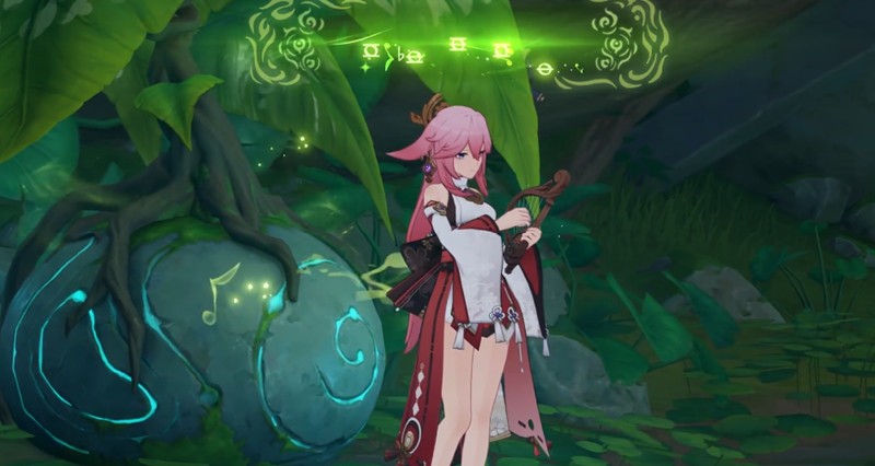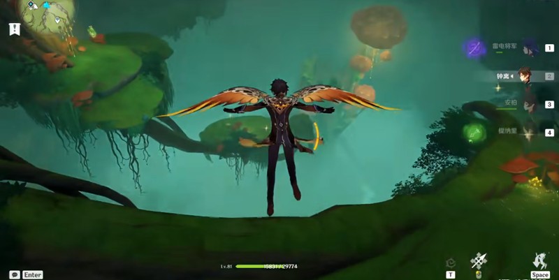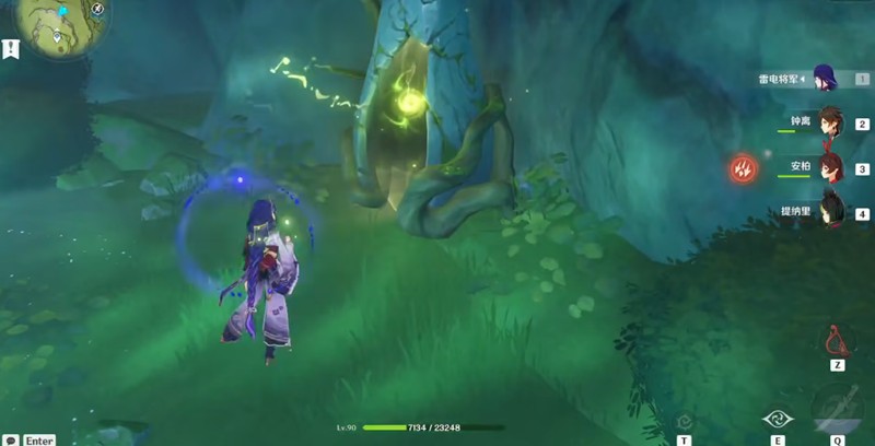靠近瓜子壳形状的洞口后,角色会自动触发交互提示。此时需要使用四叶印进行共鸣操作,也就是弹奏附近的七天神像琴(须弥城风格的竖琴),通过音乐的力量激活通道。成功触发后,角色将被传送到一个独立的秘境空间。在这个空间内,地面清晰可见三个符文图案和对应的三个树桩平台,分布在右手边的区域。
