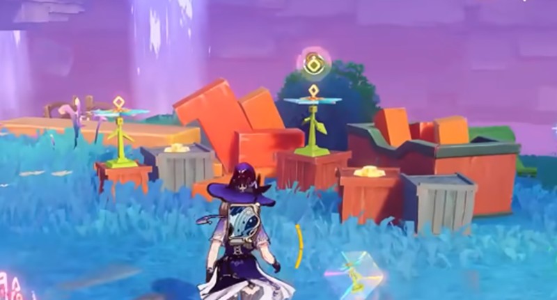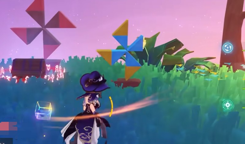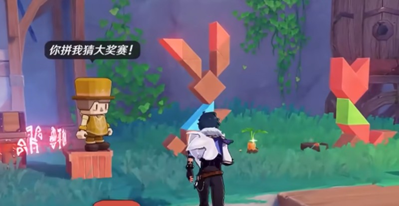 随后任务引导玩家前往破碎之海东北方向的一处红色木偶旁。此处需要使用火元素攻击周围的积木花,使其变为黑色状态。变色后的积木花需按木偶指示的顺序和方向进行摆放。摆放完成后与木偶互动,即可解锁新的宝箱。此环节考验玩家对元素反应与空间布局的理解,注意观察木偶头部朝向与积木排列样式。
