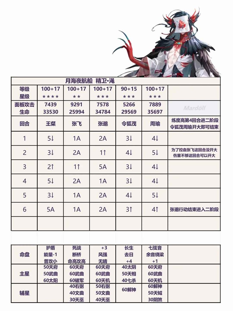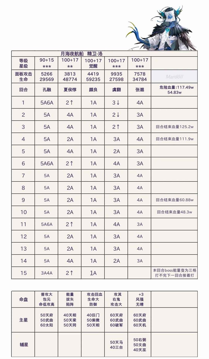 机制:速杀流,一阶段是要飞邈奶满55万,二阶段是boss血量变成82w。飞邈奶满血进入二阶段后令狐茂周瑜开大即可。五回合打不完第六回合再进二阶段,否则第五回合会秒杀全体。