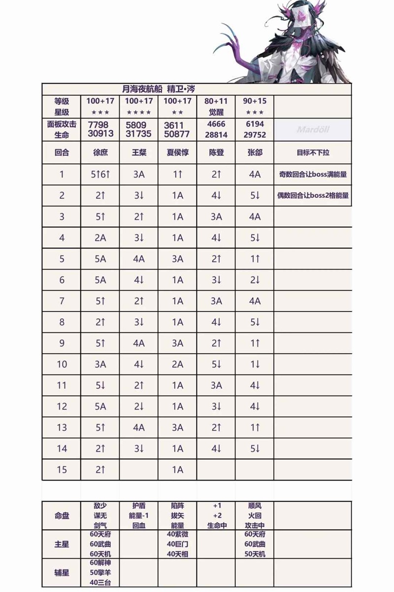 ❸第12回合结束不了四命:甄宓用的不是暗线盘,boss没有给我方破盾;徐庶用的不是剑气盘。打不完的友友自行调整,13回合不把boss能量打满,同属性密探最后行动,14回合及以后能量都打满,18回合夏侯惇开大,其余人卡血,徐庶行动两次夏侯惇助攻打掉boss