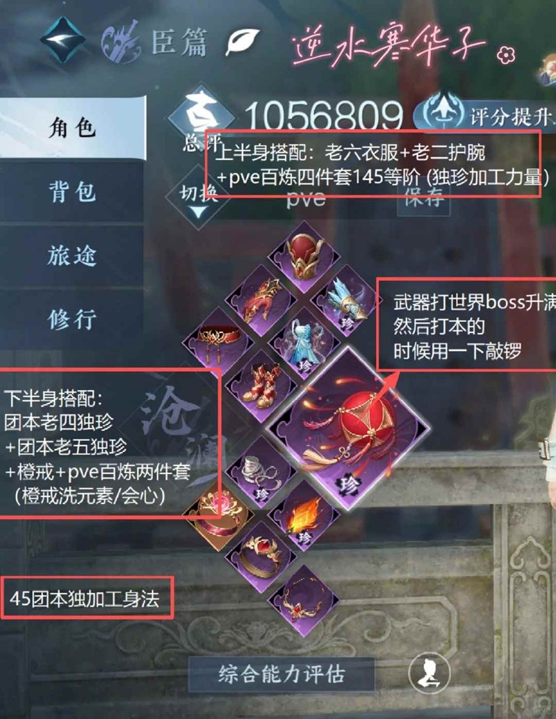 上半身搭配:老六衣服+老二护腕+pve百炼四件套145等阶(独珍加工力量)