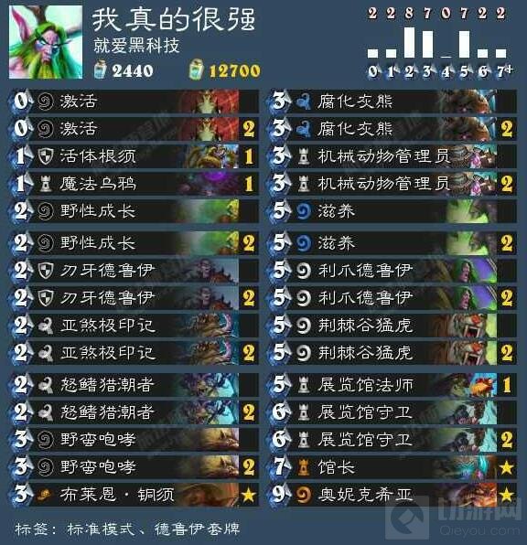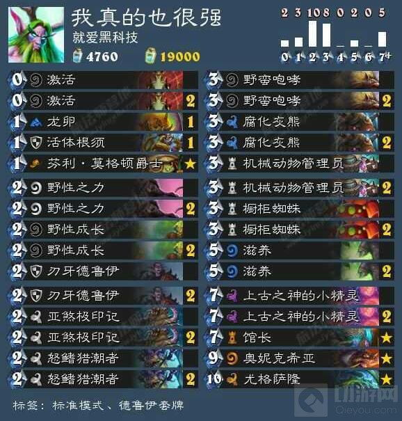 纵向杂交德前面说过骑士的杂交思路之所以行不通是因为骑士的站场收益很低,而小德拥有媲美萨满嗜血的高级斩杀法术咆哮的存在,3-4只生物加上嗜血一波就可以很快的解决掉对手。所以杂交德的厉害之处,在于生物难以清除,赖场,站场蹭血强,而且咆哮斩杀线高。这套纵向杂交德,是利用老虎和展览馆守卫,配合buff来压场,用一些小生物蹭场来达到快速斩杀的目的。另外要说的是,只要是野兽德,胡的概率非常的高。德有成长作为胡的一个方式,而野兽德还有刃牙德鲁伊和亚煞极印记作为另外一个胡的方法,后手硬币的隐身的刃牙德鲁伊,只有奥弹(并且不稳定)一个清除手段。