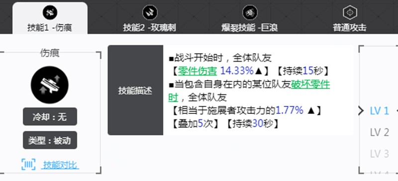 罗珊娜高雅海洋的核心技能为“伤痕”,是一项团队增益型辅助技能。在战斗开始时,该技能可为全体队友提供14.33%的零件伤害加成,持续时间长达15秒,有效覆盖开局关键输出阶段。更为重要的是,当队伍中有角色成功破坏敌方零件时,全队将再次获得额外的增益效果,且该效果支持多次叠加。这一机制使得她在高强度战斗或速攻阵容中具有较高的战术价值。