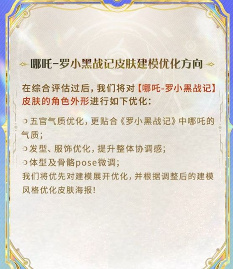 在综合评估玩家的反馈后,官方决定对哪吒的罗小黑战记皮肤进行以下优化: