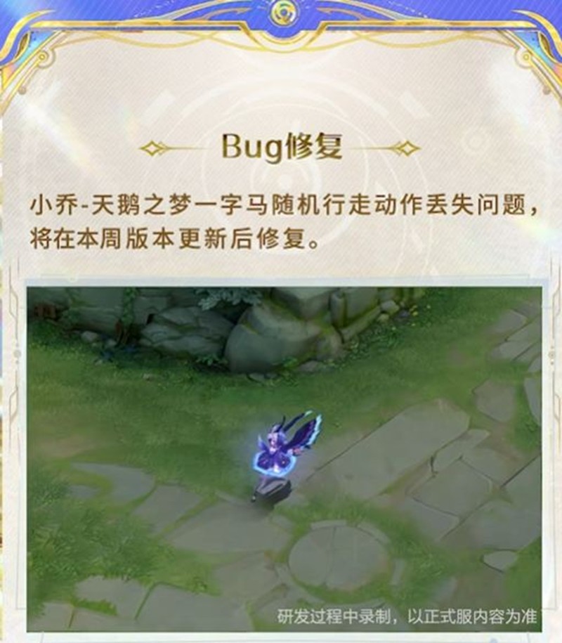 在本次更新中,官方还将修复小乔的天鹅之梦皮肤中的一个BUG。具体来说,我们将解决小乔-天鹅之梦一字马随机行走动作丢失的问题。这个问题将在本周版本更新后得到修复,确保玩家在使用这款皮肤时能够享受到完整的动作表现。