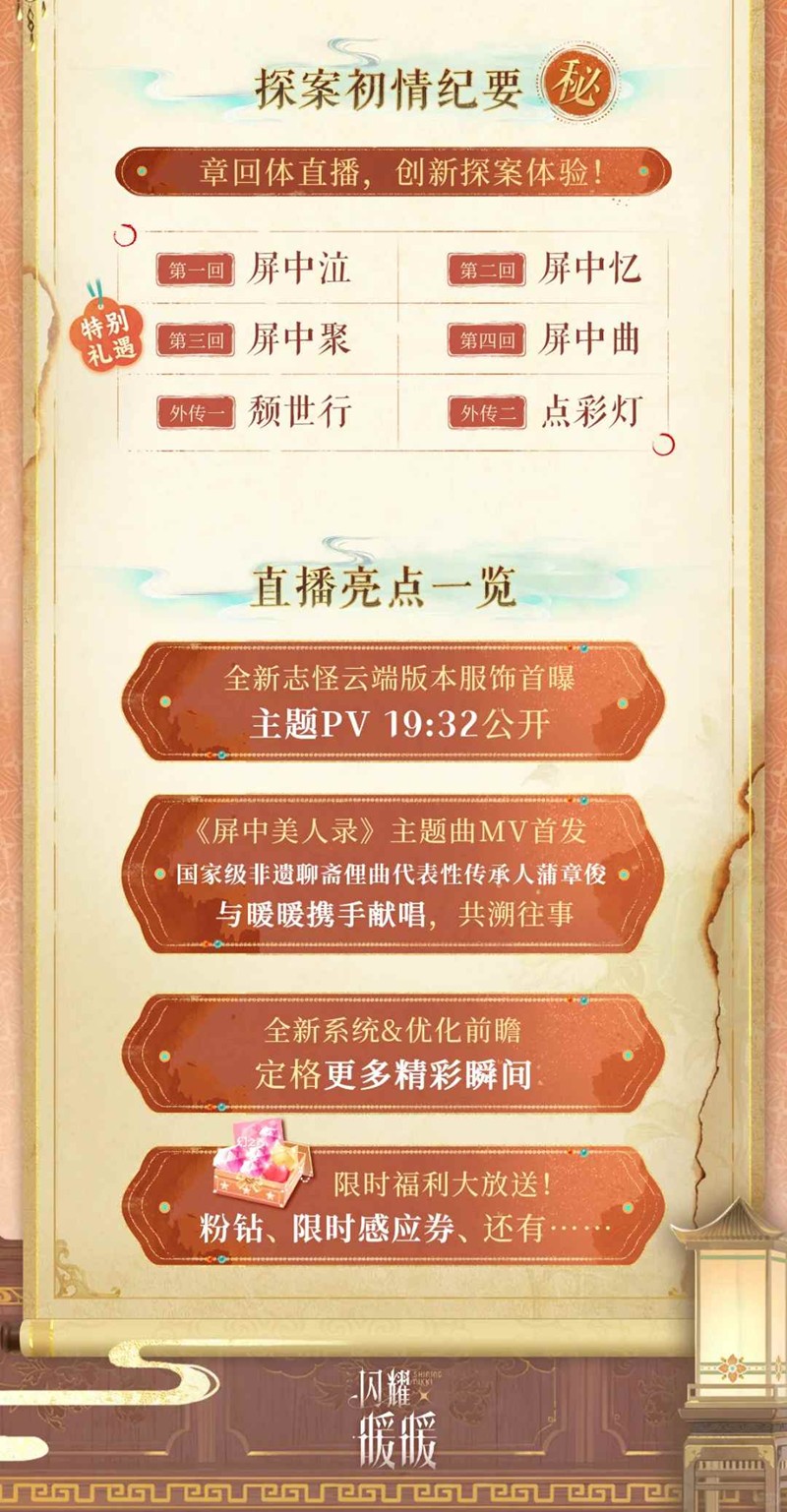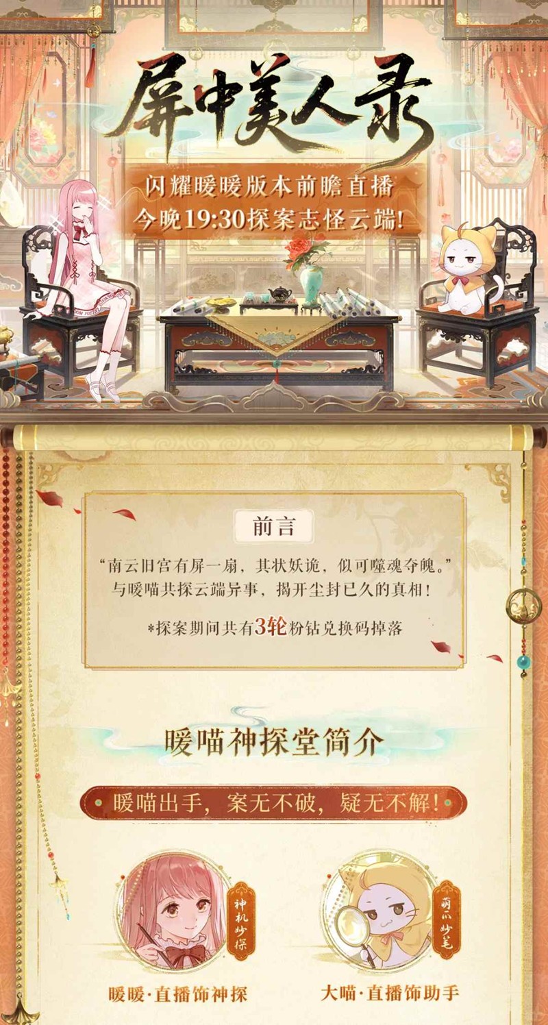 闪耀暖暖【《屏中美人录》#闪耀暖暖版本前瞻直播】章回揭晓~今晚 19:30,暖喵神探堂「神探暖暖」携「助手大喵」 ,共探云端异事,揭开尘封已久的真相!更多全新志怪云端版本爆料与福利,尽在闪耀暖暖版本前瞻直播!
