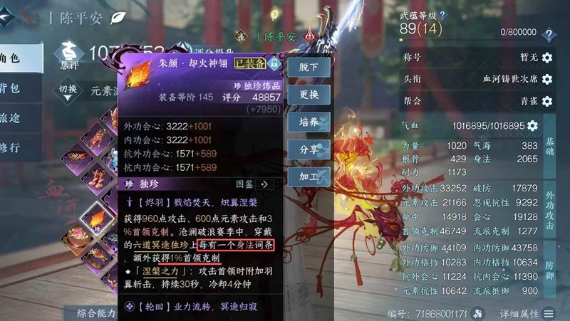 下半身:145项链+145戒子+橙戒(会心)+老四扇子(身法)+老五帽子(身法)