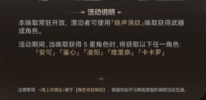 通过唤声涡纹,玩家有机会获取包含治疗机制在内的五星角色。这些角色不仅拥有独特的战斗风格,部分还具备群体回血或护盾生成能力。值得注意的是,海上共潮生等活动中的常驻换取机制设有保底规则,且保底进度与其他卡池互通,这让玩家在追求功能性角色时更具规划性。