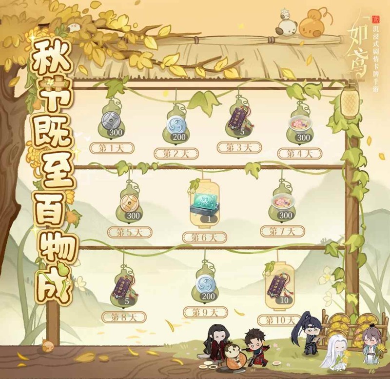 第六天:月毋相忘令*1;第七天:体力*300;第八天:符传*5;第九天:白金币*200;第十天:符传*10