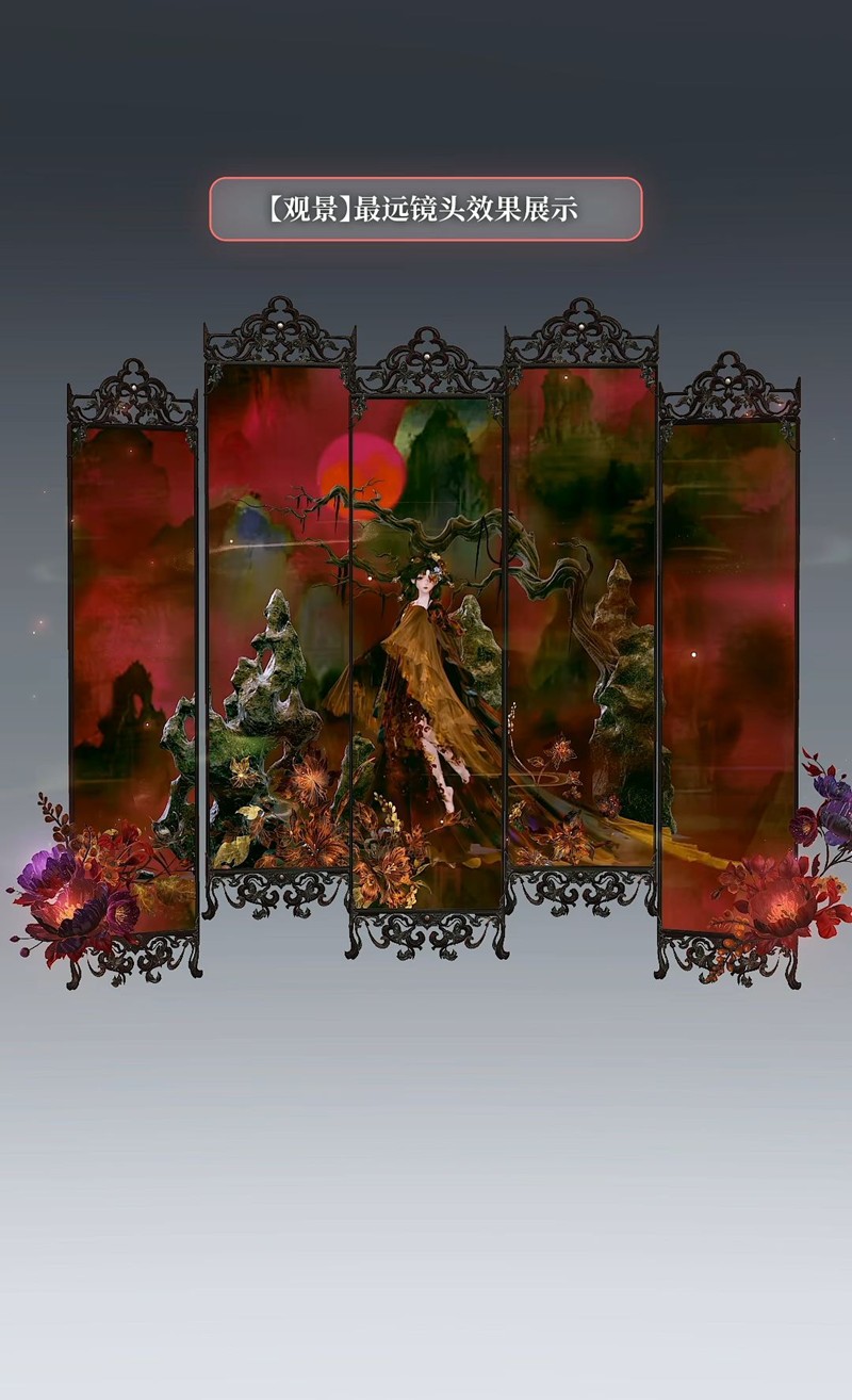 1.触发条件:穿戴背饰【千重画烬】后,可在【纱影旋梦】面板中解锁【观景&拂屏】屏风自定义功能。
