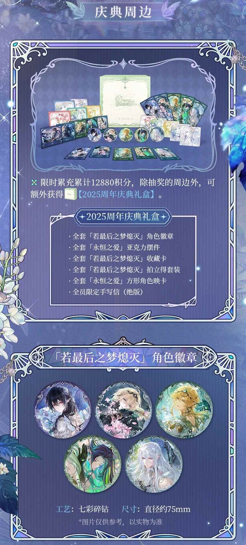 参与限时充值活动,在特定积分档位里可获得[庆典礼券],用于抽取「若梦熄」主题画灵周边。累计12880积分,可获得「2025周年庆典礼盒」。