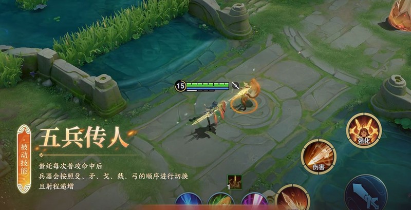 蚩奼的技能围绕铸造兵器展开,操作上限极高。她的被动技能“五兵连携”可以在普攻命中后自动切换兵器,叠加攻速、吸血与攻击距离增益。具体来说,蚩奼的技能包括: