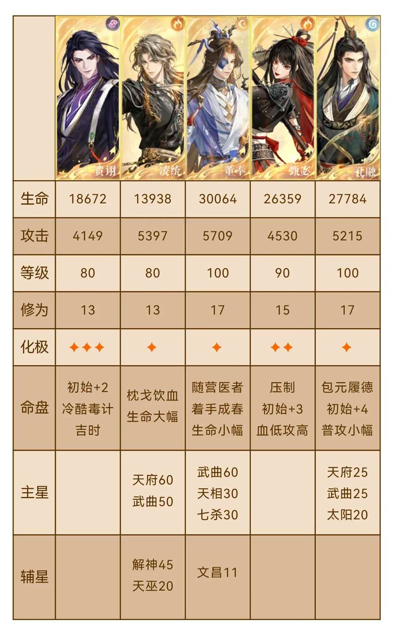 凌统攻击5400左右,后面连续3个大收工,命盘需枕戈,不要济河,因为每回合开始扣血,后面3回合可能生存会有问题(还没开济河格子)