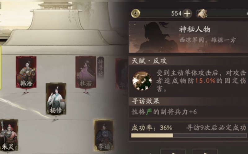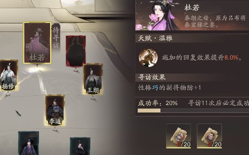 在进行副将招募前,玩家需要先确定队伍中的主帅人选。主帅是整个队伍的核心,而副将则能在战斗中提供各种增益效果。在探访界面中,已收集的副将会直接显示,未获得的角色则会以神秘人物的形式出现,同时会展示该角色的技能信息,玩家可以直接选择寻访来寻找这些副将。