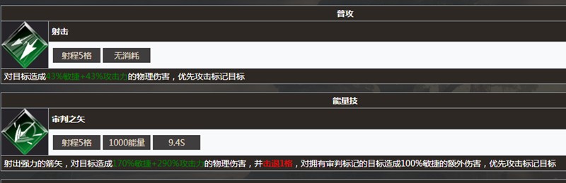 作为莫拉的核心能量技能,审判之矢在释放时可对目标造成高达290%攻击力与170%敏捷的巨额伤害,并附带击退一格的控制效果。若目标身上存在审判标记,则额外承受100%敏捷伤害。该技能不仅具备强力的单体爆发能力,还能通过标记联动实现伤害叠加,配合队伍中的控制或标记类技能时,能显著提升整体输出效率。