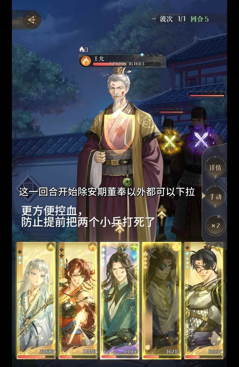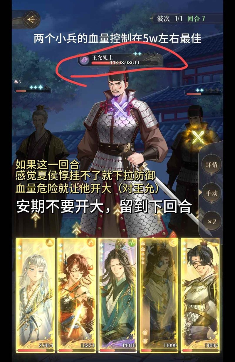 第5回合开始,香香就可以下拉了,要多关注小兵的血量,尽量在第7回合开始的时候,小兵血量剩余5w左右