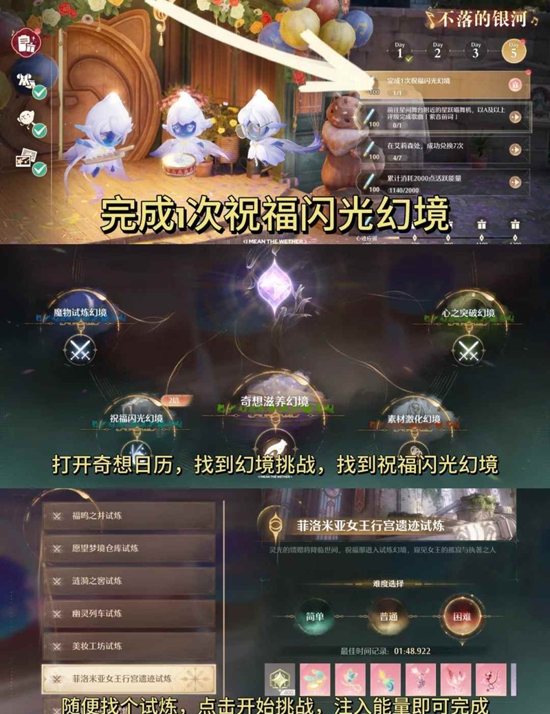 打开奇想日历,找到幻境挑战,找到祝福闪光幻境,进去随便找个试炼,点击开始快速挑战,注入活跃能量即可