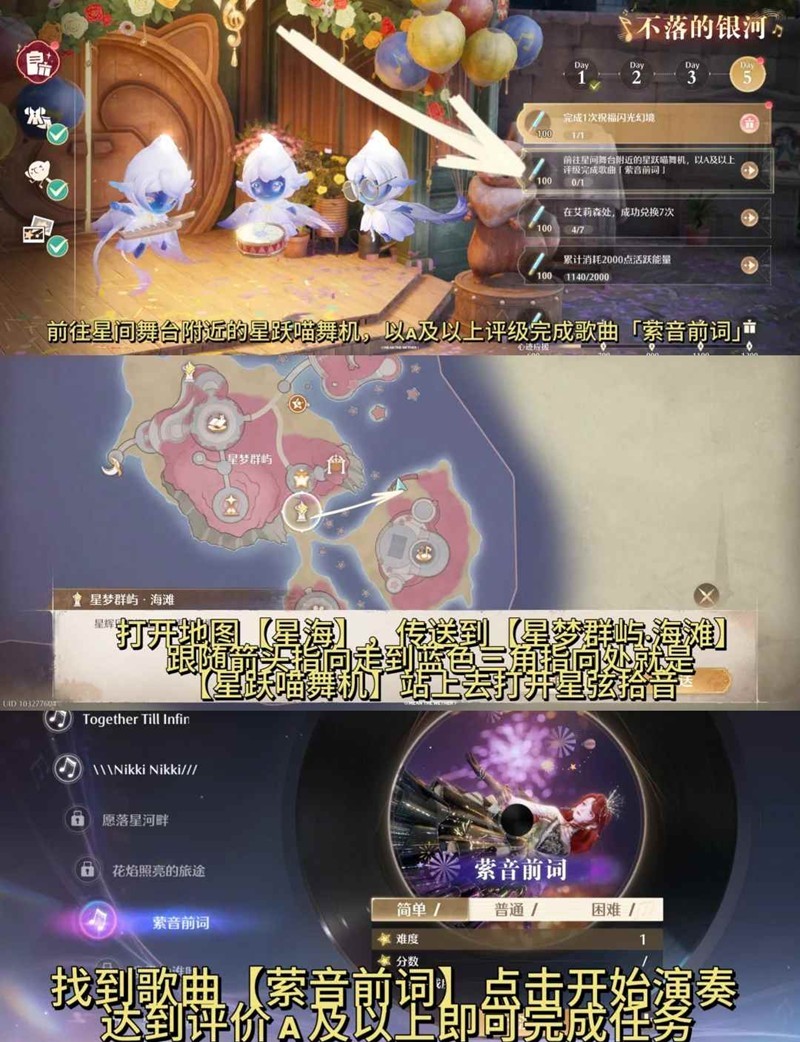 打开地图找到星海,传送到【星梦群屿·海滩】跟随箭头指向走到蓝色三角指向处就是【星跃喵舞机】站上去打开星弦拾音,找到舞曲【萦音前词】,点击演奏,达到评价A及以上即可完成任务