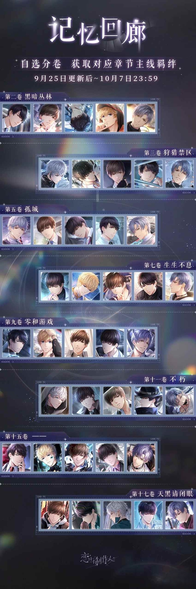 恋与制作人记忆回廊:限时自选复刻今日已开启~制作人可从【黑暗丛林】、【狩猎禁区】、【孤城】、【生生不息】、【零和游戏】、【不朽】、【——】、【天黑请闭眼】八卷中,任选一期开启对应主线羁绊获取活动,不受主线通关进度限制。一起来和小编看看吧~